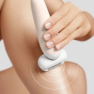 L’embout avec rouleau de massage stimule en douceur les peaux mouillées et sèches pour plus de confort lors de l’utilisation de votre épilateur.